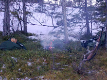 Hoewel ik een vol uur heb gelopen verplaatste ik mij hemelsbreed maar 7 km. Doordat het (eindelijk) is gaan dooien is de sneeuw "rot". Dat wil zeggen dat alle lagen in de sneeuw geen of weinig verbinding meer hebben met elkaar. Met als resultaat dat ik vrijwel de hele wandeling tot aan het kruis in de sneeuw wegzakte. Bijkomend voordeel is wel dat de de circulatie weer goed op gang kwam en het was een verademing om even niet op de langlauf skies te staan, maar gewoon te wandelen. Na aan te zijn gekomen op de plaats waar ik wilde vertoeven, de komende twee nachten en 2 en een halve dag, direct het eerste hout verzameld en een vuur aangelegd. Ik vulde mijn ketel met sneeuw en zette deze in het vuur. (lees verder onder het kopje "Ondernemingen"